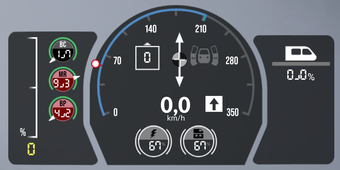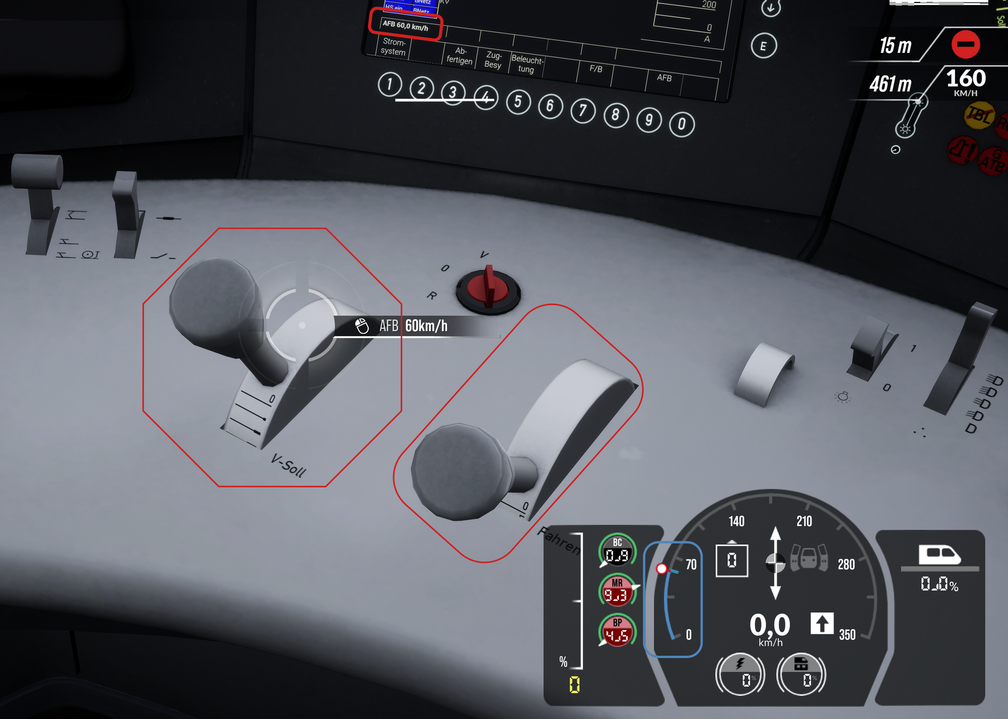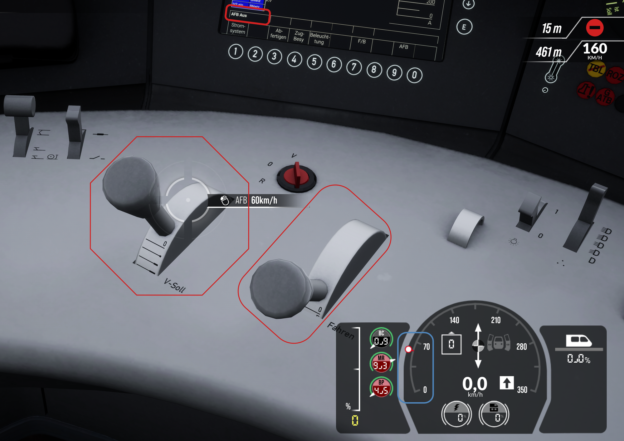 To finish up, lets look at the initial shot of the console again (between the last screenshot and this the AFB target speed was set to 60 KPH by me to cause a starker change in the final screenshot, your screen will still show 0,0 KPH across the consoles but the blue area in the tachometer HUD will still be there regardless):