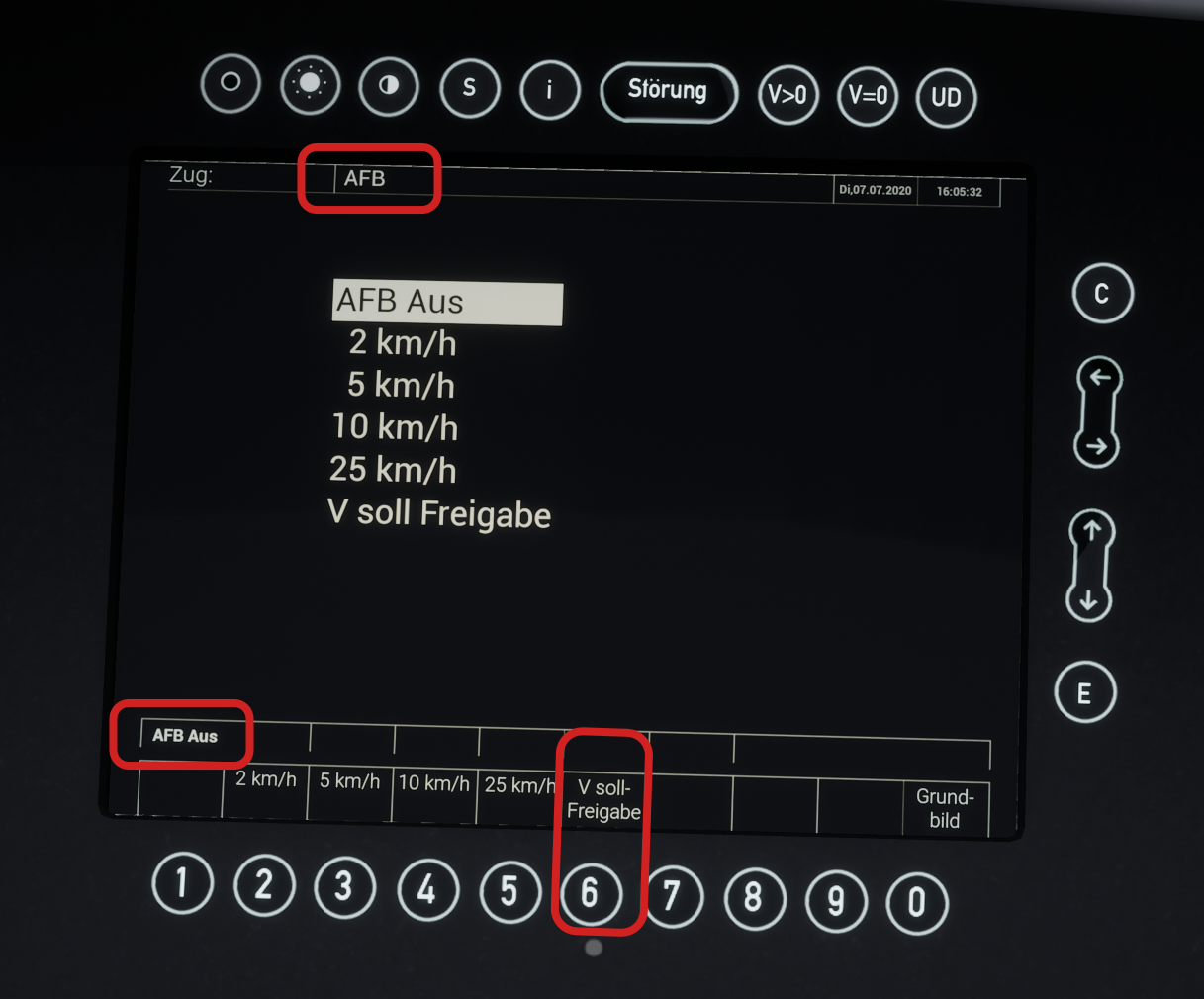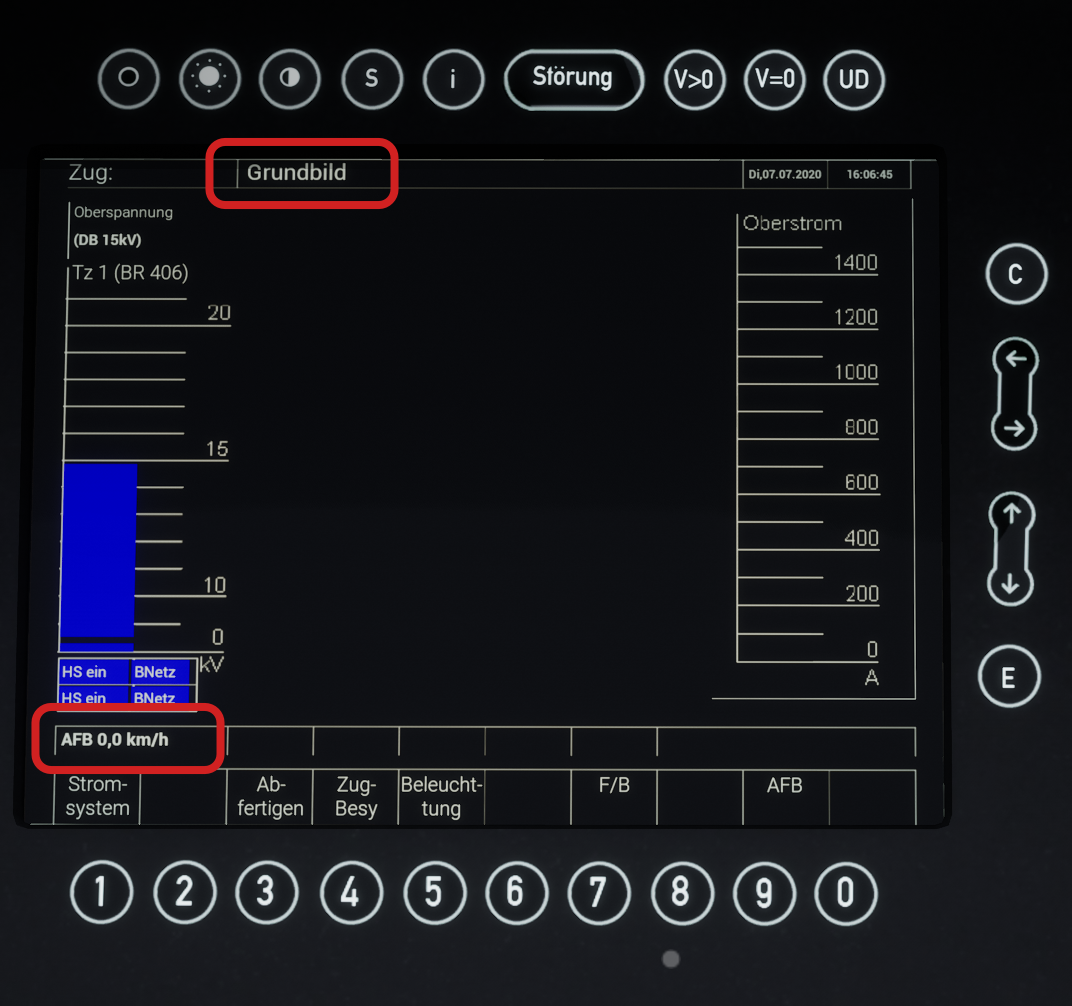 Now we can see that the AFB is active and currently set to 0,0 KPH (bottom left). Now we can leave this screen so left-click on button 0. Then we are back at the Grundbild (German for Home Screen):