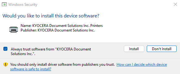 First up, during the preparation of the reference computer, you had to install the Kyocera driver (or any other printer driver you need that incidentally has an Authenticode-signed driver, I will stick with Kyocera as my example) and during that install, Windows has prompted you for permission to install that driver, like this: