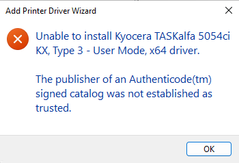 Throughout the whole article I focused on Kyocera but if other manufacturer also use Authenticode, this solution, as in, trying a higher or lower model driver which is not signed with the Authenticode certificate chain, should also work.
