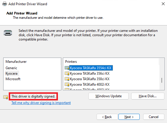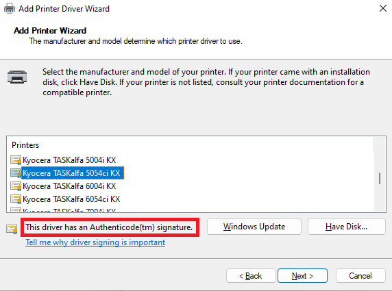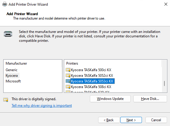 In the first Add Printer Driver Wizard I purposefully selected the Kyocera TASKalfa 5054ci KX driver because this model only has the Authenticode-signed variant with the version 8.0.3028 available, the newer 8.2.0623 variant doesn't exist for it (yet):