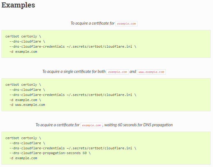 Why? Let's look at the examples given for the Cloudflare DNS plugin: