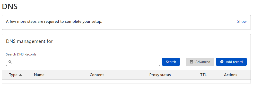 To create the DNS records, open https://dash.cloudflare.com/, click on the zone name you want to use for redirects, and click on DNS in the left nav bar. You will be greeted by the DNS management for the selected domain/zone: