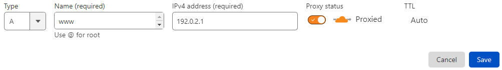 Type: A | Name: www | Content: 192.0.2.1 | Proxy status: Proxied | TTL: Auto