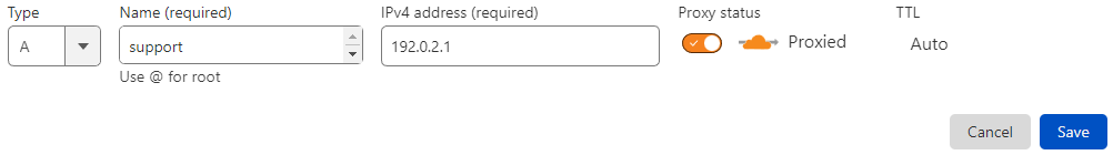 Type: A | Name: support | Content: 192.0.2.1 | Proxy status: Proxied |