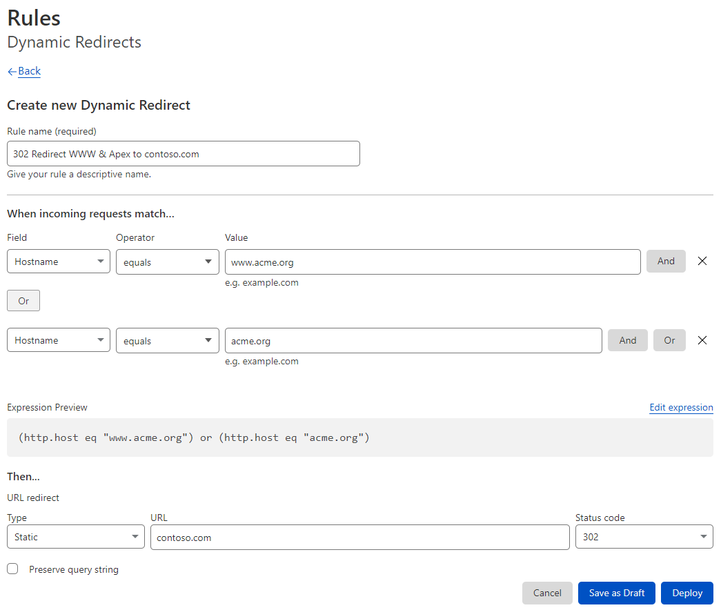 - Example 1: We want acme.org and www.acme.org to redirect to contoso.com