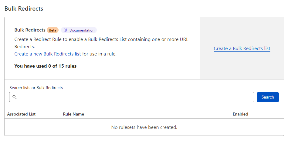 Now, for the last section of this guide, we will quickly talk about Bulk Redirects. Bulk Redirects are account-based, so the link is directly found in the nav bar of https://dash.cloudflare.com/ this time. You will arrive here: