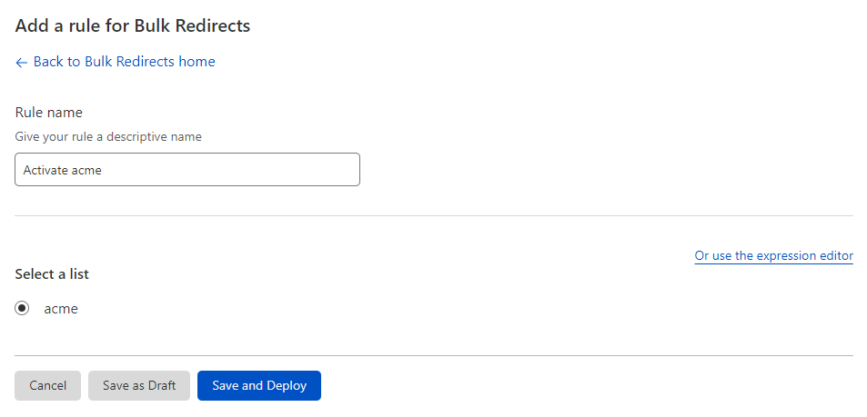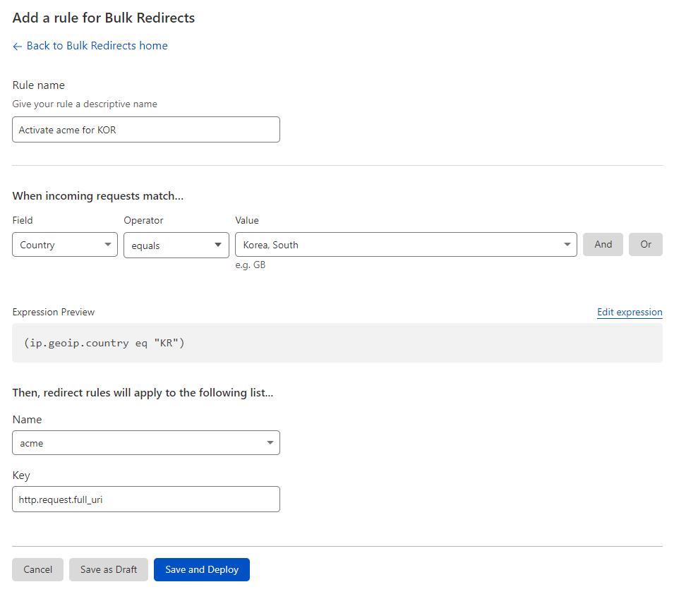 Lastly, we will configure the rule itself, go to https://dash.cloudflare.com/ and then Bulk Redirects, as shown at the beginning of the paragraph.