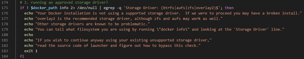 Your Docker installation is not using a supported storage driver. If we were to proceed you may have a broken install.
